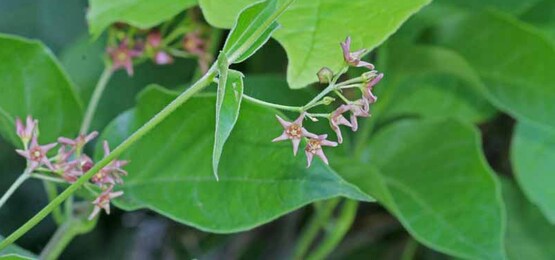 Swallow-worts are vines, and form dense mats. Their leaves generally grow in large, shiny, dark green, opposite pairs, though the color and shape vary slightly based on location. Their seeds are enclosed in slender pods similar to those of milkweed, which are green while developing and turn brown and split open to disperse seeds when mature. Also similar to milkweed, the seeds are borne by white fluff and carried by the wind. The flowers are small and star shaped with five petals- very dark purple on black swallow-wort and pink to reddish brown on pale swallow-wort. Black swallow-wort also spreads from rhizomes located at the base of the stem that can sprout and grow into new vines, so that several stems can be traced to the same base.;